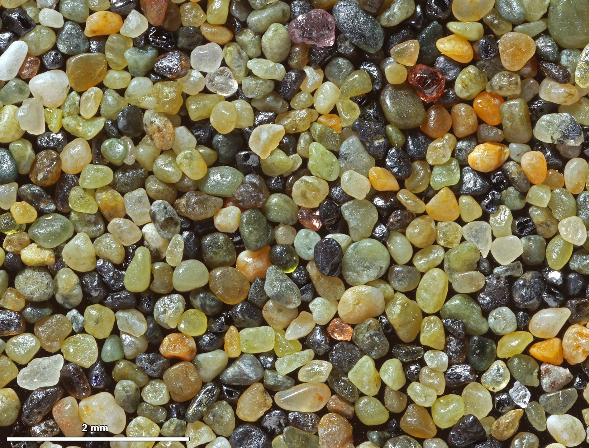The sand on the beach; however, does change with the seasons. This sample, collected in winter, contains mostly fine-grained, yellowish-green epidote, a heavy mineral, plus opaque chromite. During the winter when high energy waves slam the shore, the less dense minerals, including quartz, are swept into deeper water, and the fine-grained, heavy minerals concentrate on the shore. When the milder summer waves return, the quartz sand returns and buries the denser mineral grains.